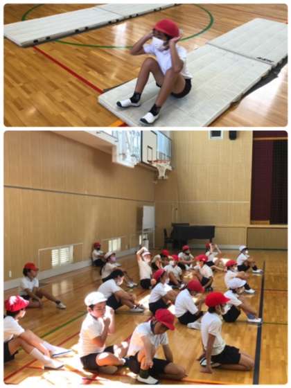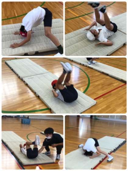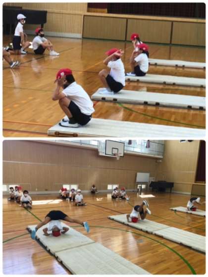 体育科で難しい開脚後転をしました。コツを掴むのにもう少し!頑張って練習しましょう!
