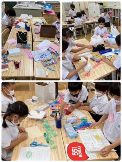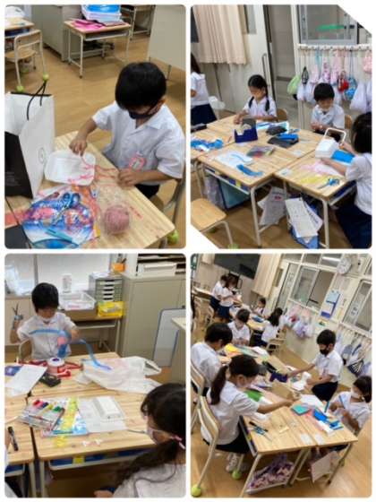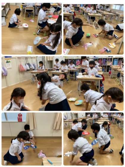 昨日の1年3組の様子です。生活科で廃材を使い、動くおもちゃを作りました。どれも工夫の詰め込まれた作品となりました。