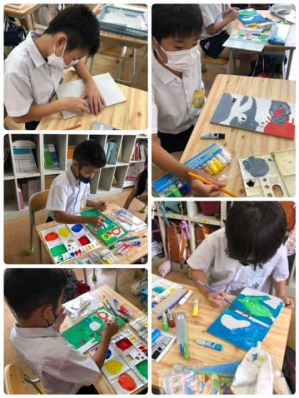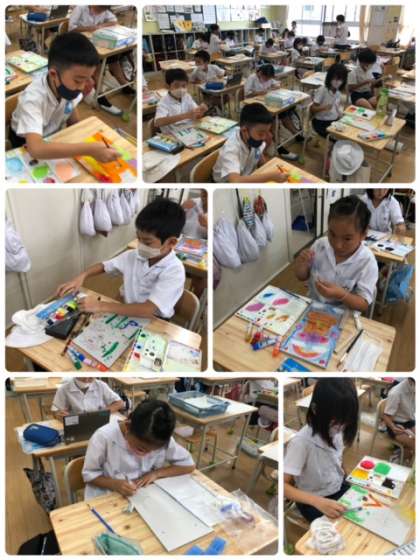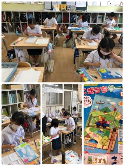 図工科で、釘打ちゲームを作っています。今日は、釘を打つ土台の下絵を描いたり、色を塗ったりしました。