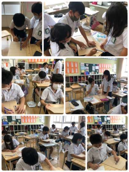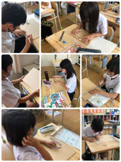 4年生は、図工科で鉛筆立てを作るようです。今日は電動ノコギリで切るための線を引きました。