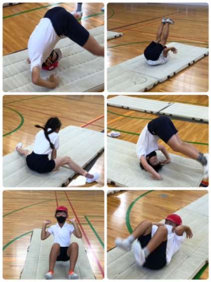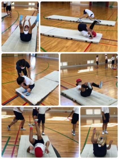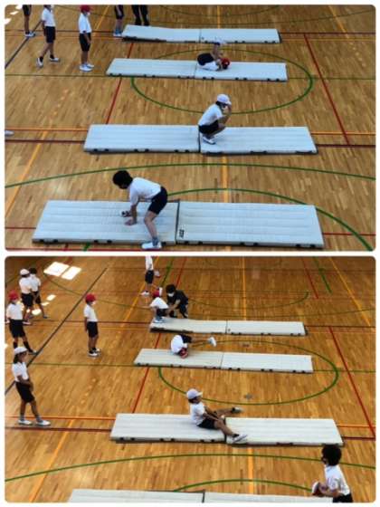 先週に続き、マット運動をおこないました。開脚後転、開脚前転にチャレンジ中です。