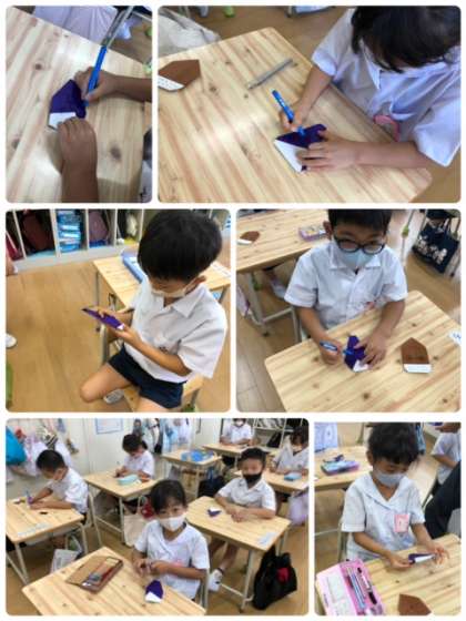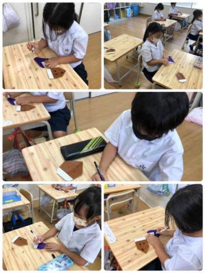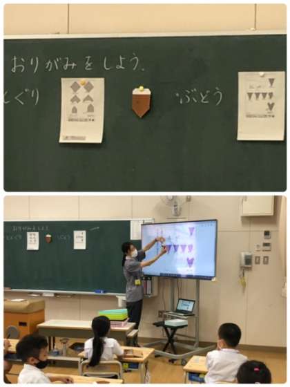 図工科の学習で、折り紙を使いぶどうとどんぐりを折り、フェルトペンで模様を書き足しました。