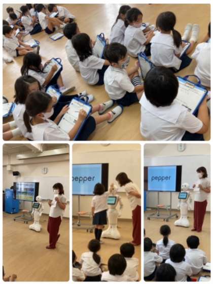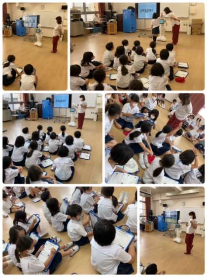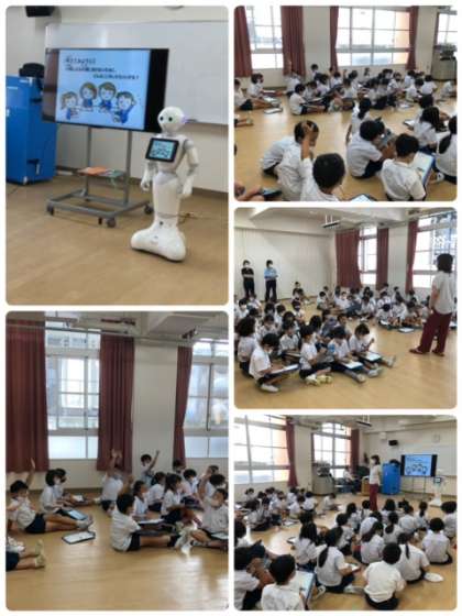 ?今日は、1年生と2年生がソフトバンクから来たペッパーくんと、SDGsの中の防災について学習しました。こちらは2年生の様子です!