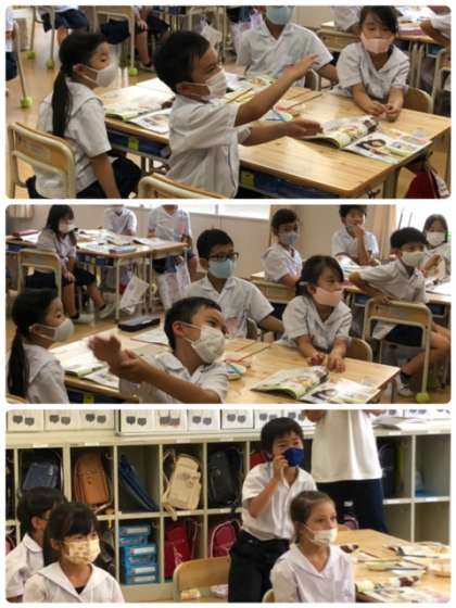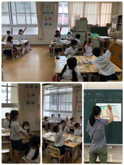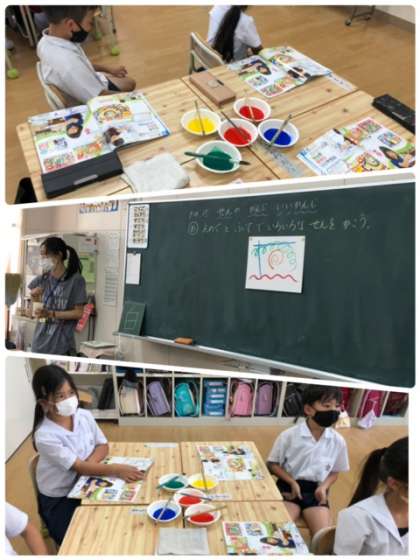 えのぐを使って、線を引く学習をしました。机に置かれた5色のえのぐで画用紙いっぱいに線を引きます。