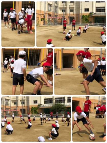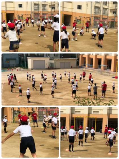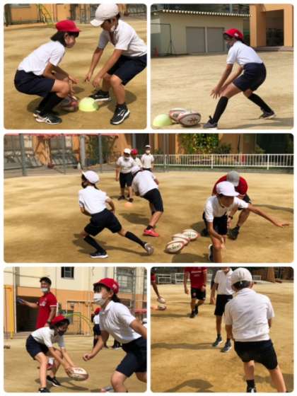 今日は出前授業で、NTTドコモレッドハリケーンズの皆さんに来ていただき、ラグビーを通して夢やスポーツの楽しさを教えていただきました。