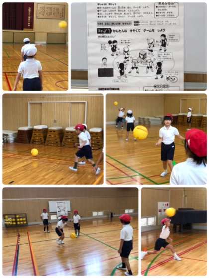 体育科でボール運動をしました。練習では、友達に向かってなげ、その後は的をめがけて投げました。