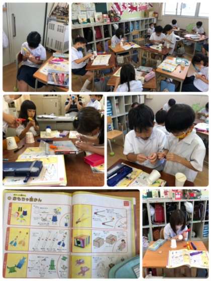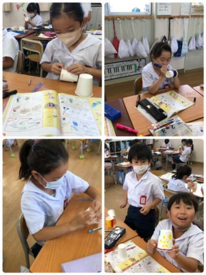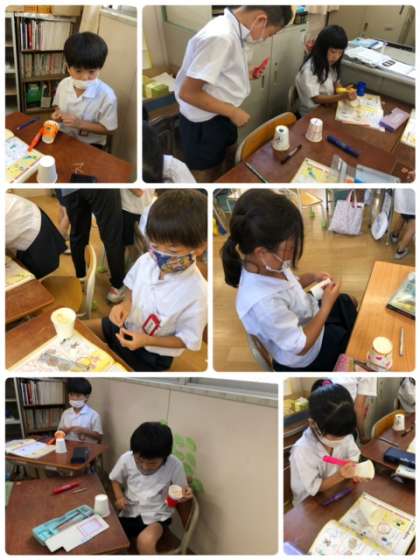 今日は、生活科で紙コップロケットを作りました。輪ゴムを通したり、色を塗ったりして1人1人の想いを乗せたロケットが完成しました。