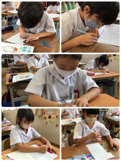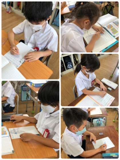 算数科の学習で、方眼紙に正確に長方形を描いています。真っ直ぐな線を引くのが難しい…