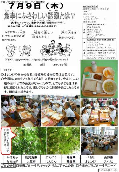 毎日食育通信:今週は2年と5年で交流給食をしています。(7月9日)