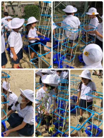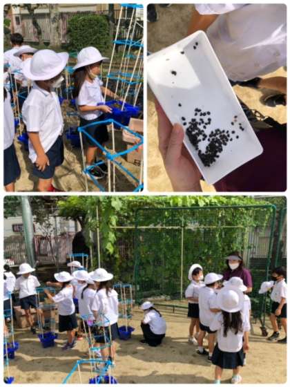 1学期から夏休みも通してお世話してきたアサガオの種を生活科の時間に収穫しました。