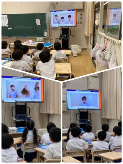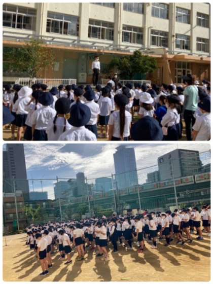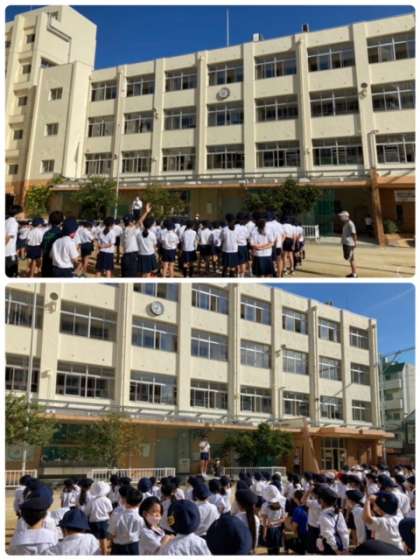 晴天の下、児童朝会を行いました。「秋を感じる季節になりました。」と校長先生のお話があり、その後運営委員会から、上福島小学校のマスコットの名前について話がありました。教室に帰って、すぐに動画で確認をしたようです。