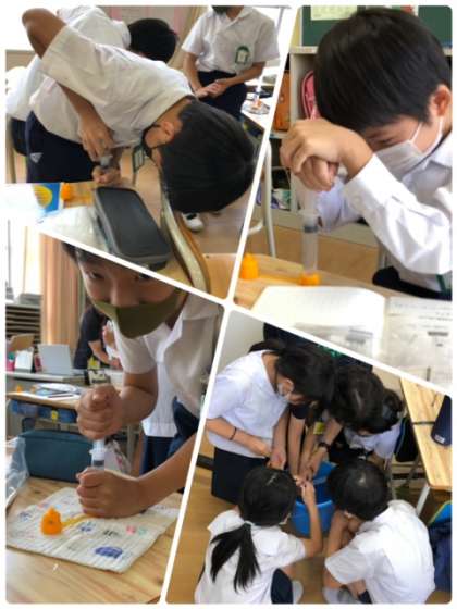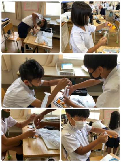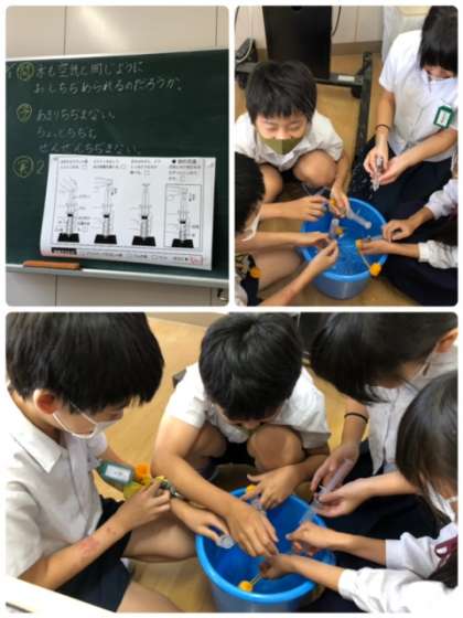 理科の学習で、前回の空気と同じように水も力強く押してみるとどうなるか実験中です。