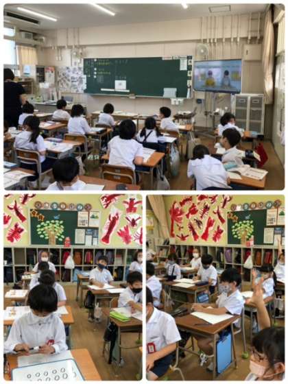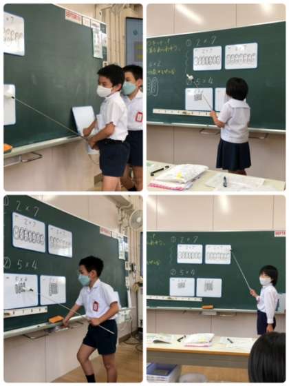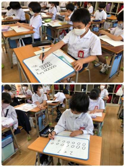 算数科の学習で、考え方をまとめてホワイトボードに書き、前に出て発表しています。聞いている児童も、しっかりと目で話を聞いています。