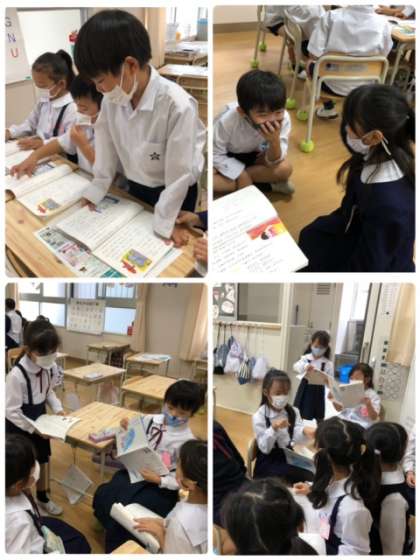 国語科「サラダでげんき」の音読をしています。ペアやグループに分かれて、役割を決めて練習しています。中にはジェスチャーをつけて読む児童も…