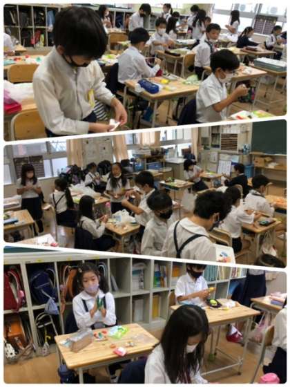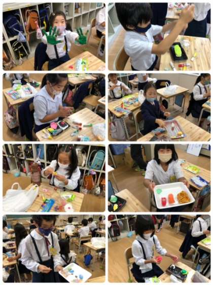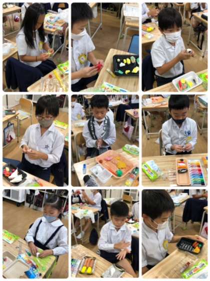 図工科の学習で、ねんどに絵の具を混ぜてお弁当を作っています。お寿司やウィンナー、ハンバーグなどとても美味しそうな物ができています。