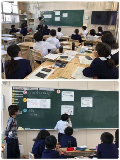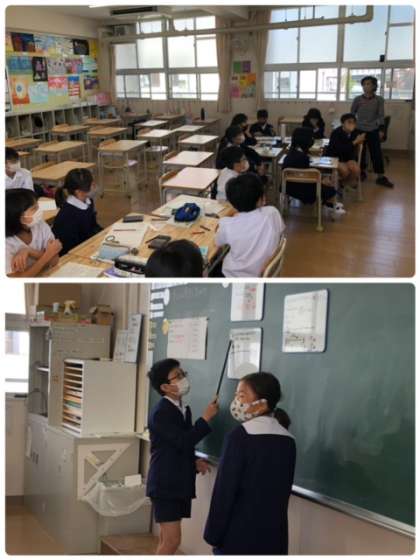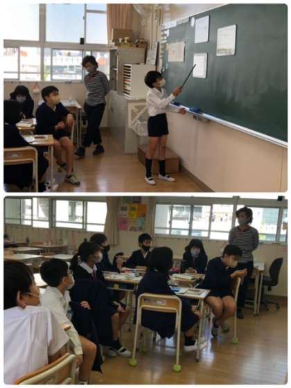 算数科で平均の学習をしています。グループで話し合い考え方をまとめました。代表者が前で発表しています。