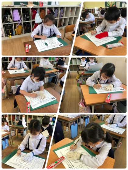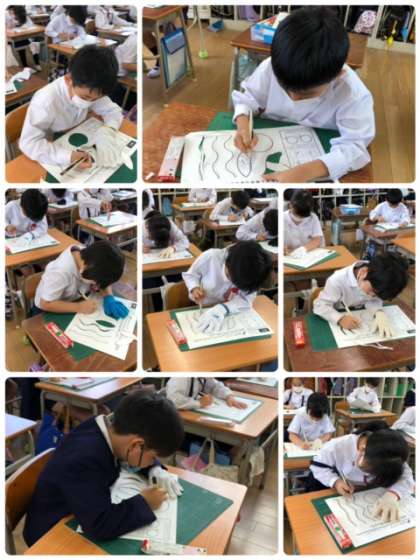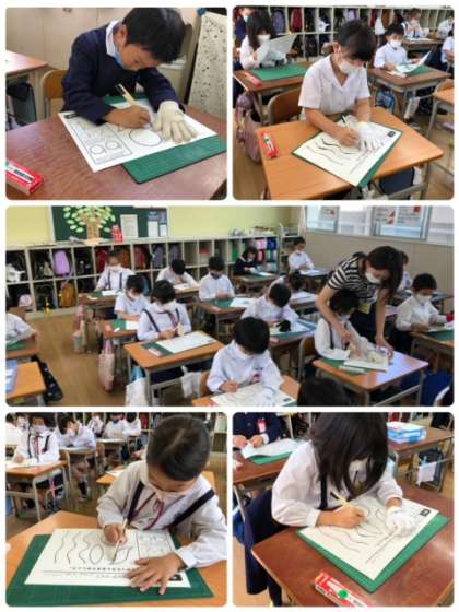 先週に続き、カッターを使って紙を切る練習をしています。安全に気をつけながら、丁寧に直線や曲線を切っていきます!