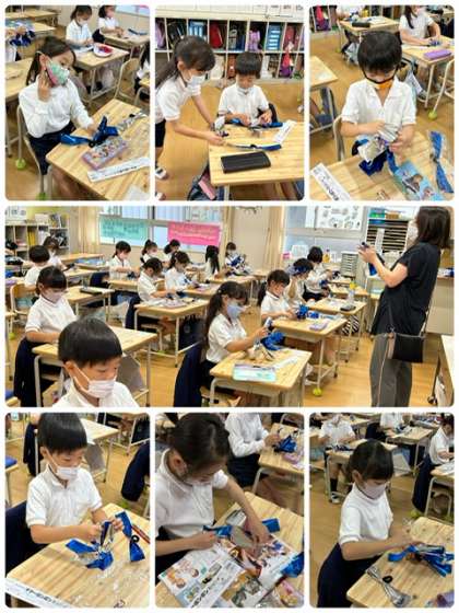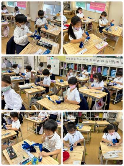 運動会のダンスのために、1年生がポンポンを作っていました。キラキラとしていて、とても綺麗です。きっとダンスに華を添えてくれる事でしょう。