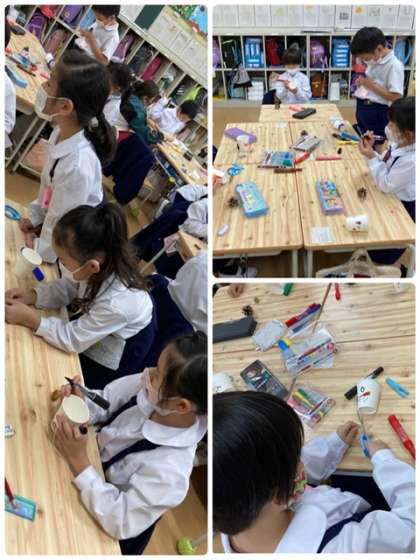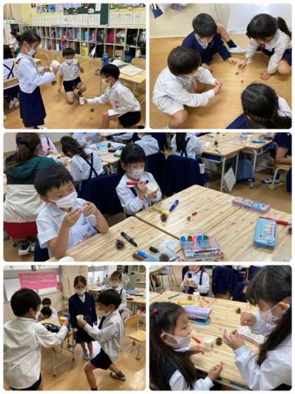 松ぼっくりでけん玉を作ったり、どんぐりで駒を作りました。