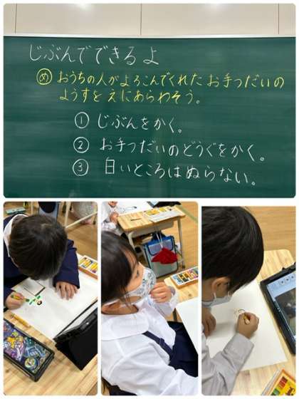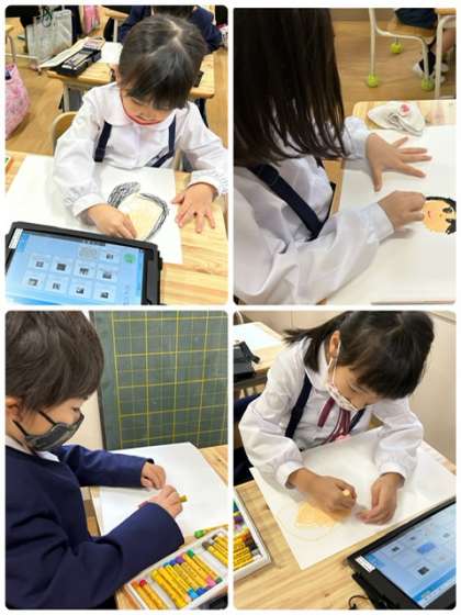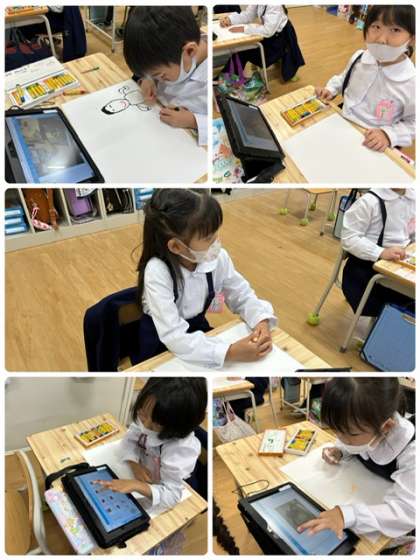 ?生活科の学習です。自宅でタブレットを使って撮影してきた写真をもとに絵を描きます。家での頑張りを上手に描けるといいですね!