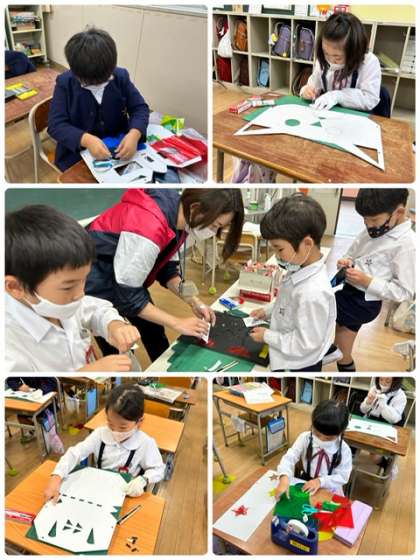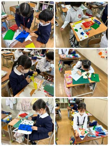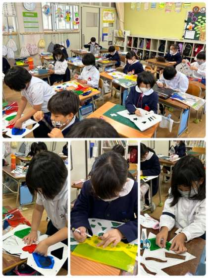 ?図工科でカラーフイルムを貼り、綺麗な作品を作っています。カッターで切り抜いた所に、カラーフイルムを貼ります。