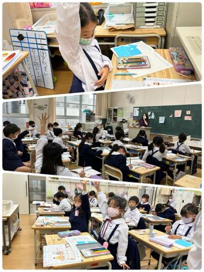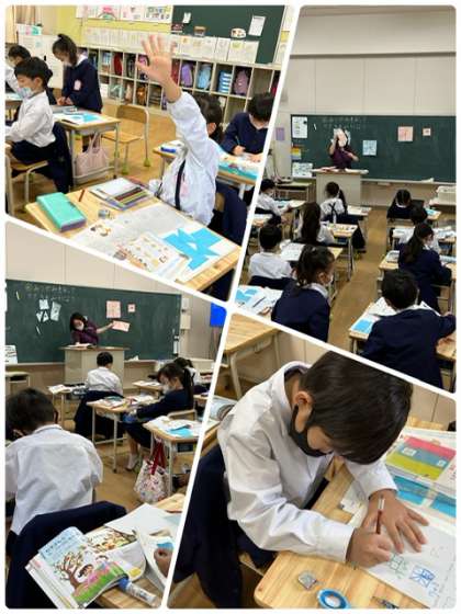 ?算数科で、かたちを学習しました。折り紙を折って、折り目から三角形や四角形を見つけます!