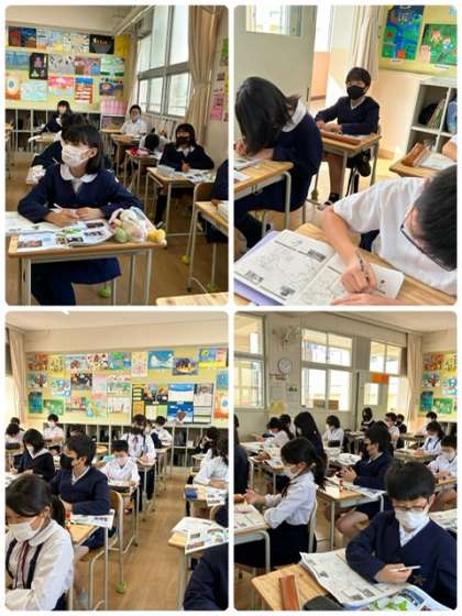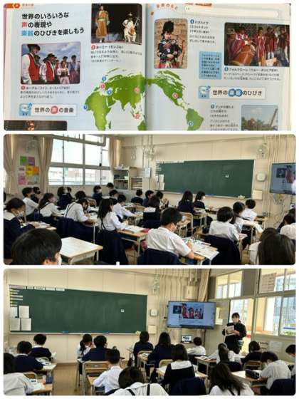 音楽科の時間に世界の音楽について学習しているようです。よく耳をすましながら、聞こえてくる音楽の特徴をワークシートに書いていました。