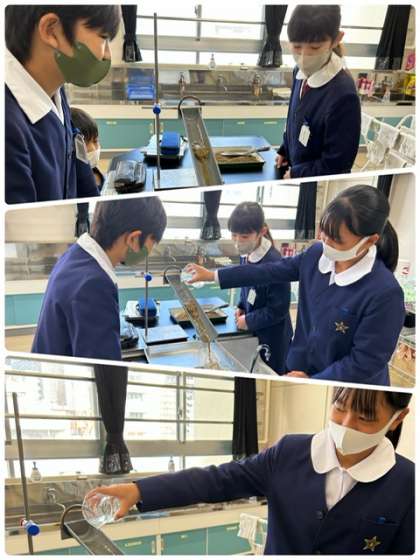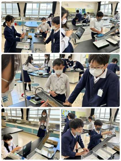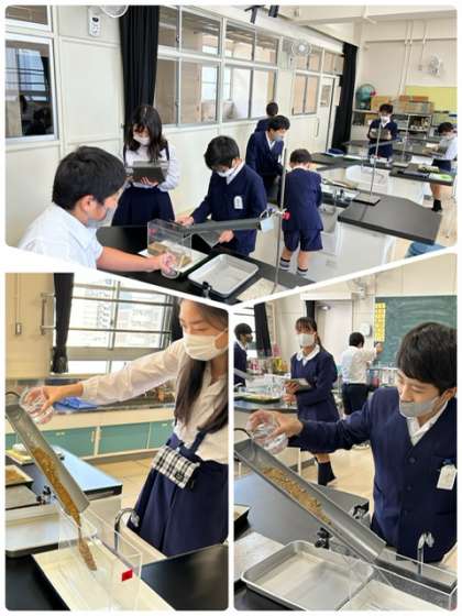 理科で、土を流してその堆積する様子を調べました。また、その様子をタブレットで、撮影し更に考察にいかします。