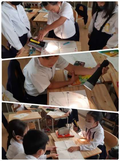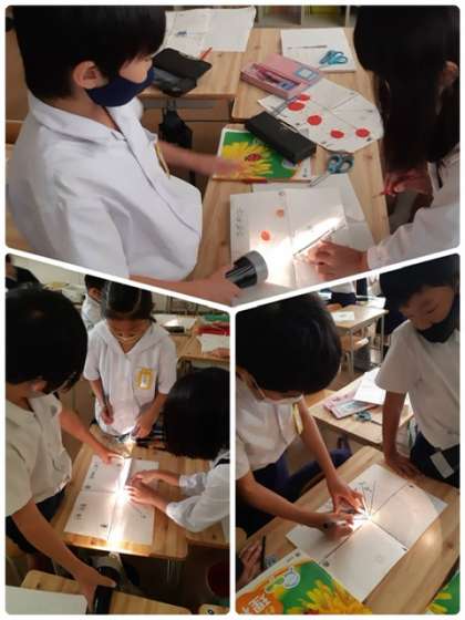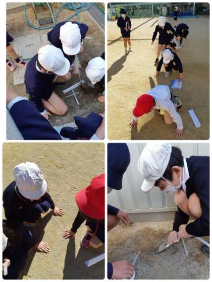 太陽の動き方による、影のでき方や、日向と日陰の暖かさの違いについて運動場で実験したり、懐中電灯で太陽の代わりをして実験したりしました。