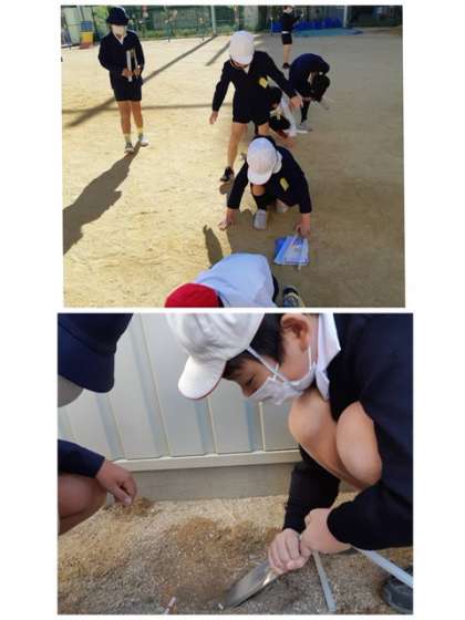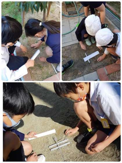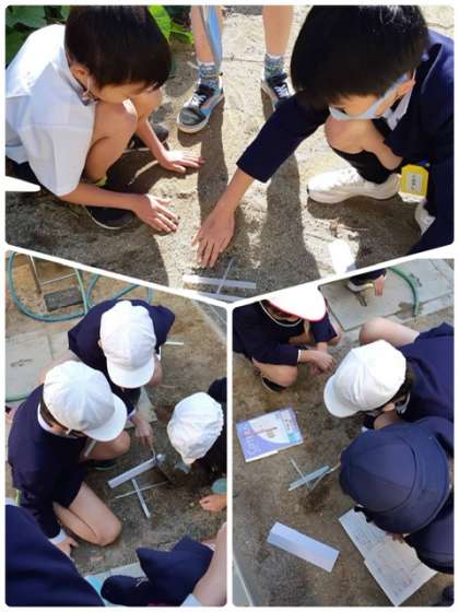 太陽の光が当たる日向と日陰で土の中の温度や表面の温度について考えました。