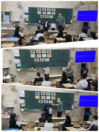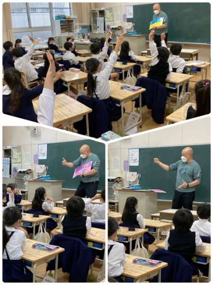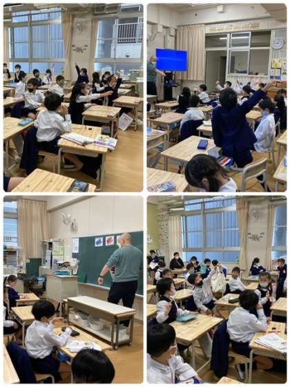 今日はいつも、3年生から6年生の外国語の授業をしていただいてるパトリック先生が低学年の授業に来てくださいました。みんなノリノリで楽しく学習できたようです!