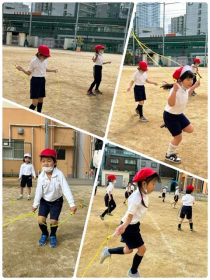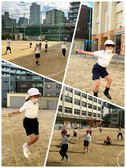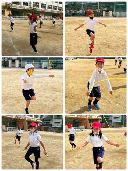 昨日とは違い、めっきりと気温も下がり、寒い運動場ですが、1年生が元気になわとびをしています。いろいろな跳び方にチャレンジしています。