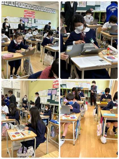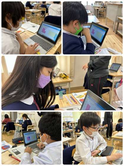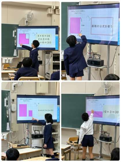 算数科の学習で、複雑な形の面積をまとめました。考え方を発表するために、タブレットで考えをまとめました。