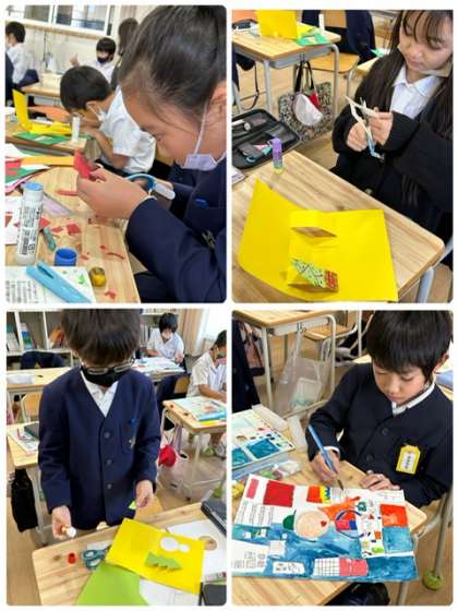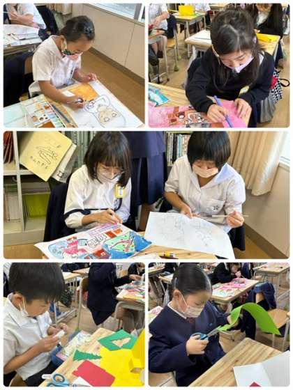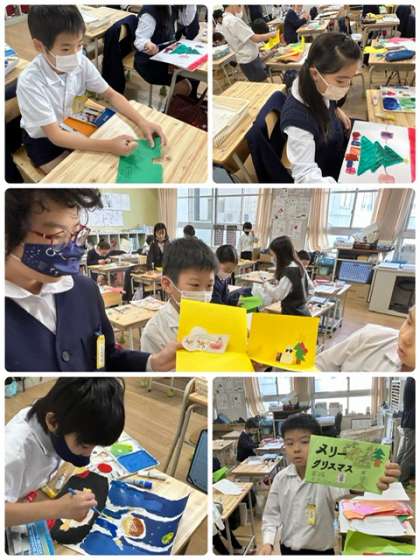 図工科の学習でクリスマスカードを作りました。飛び出す工夫や、色塗りの工夫など、楽しい作品がたくさんありました。