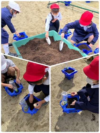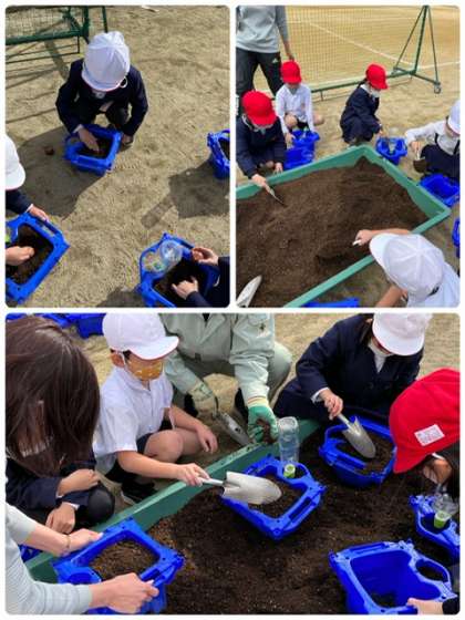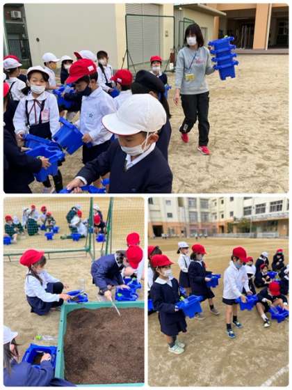 寒空の下、1年生がプランターにチューリップの球根を植えました。どんな綺麗なチューリップが咲くか楽しみですね!