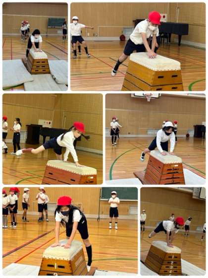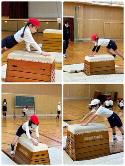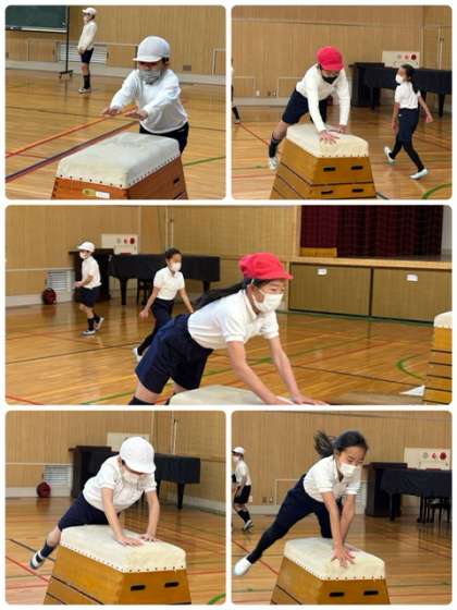 講堂で跳び箱運動をしていました。手のつく位置や、踏み切る位置などに注意しながら活動していました。