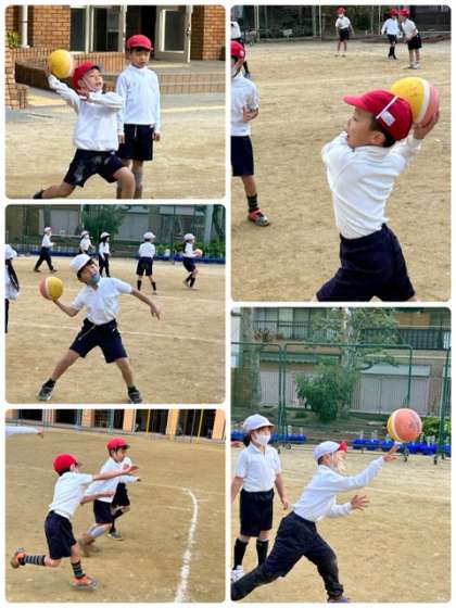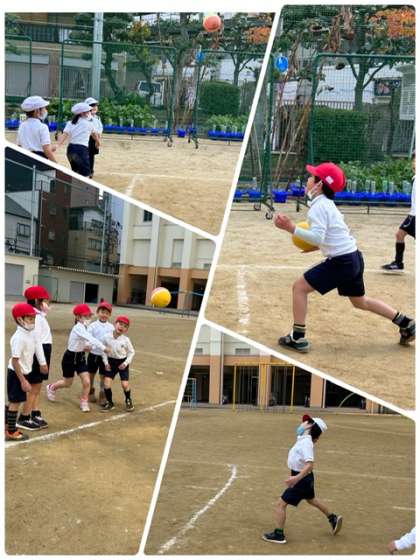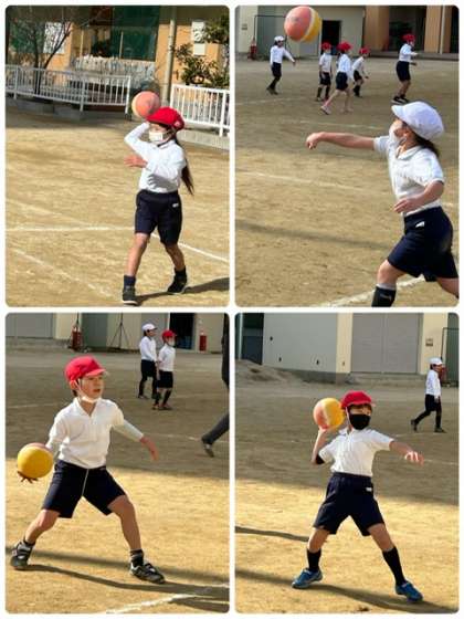 体育科の学習で、ドッジボールをしています。ボールを投げるのも、受けるのも上手になってきました。