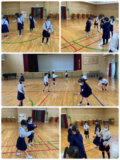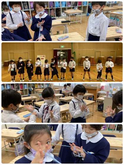 生活科の学習で、昔の遊びをしました。けん玉や羽子板、あやとりをしました。初めての経験なのか、とても楽しんでいました。