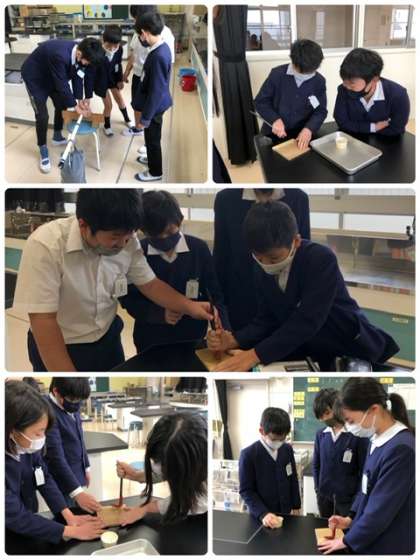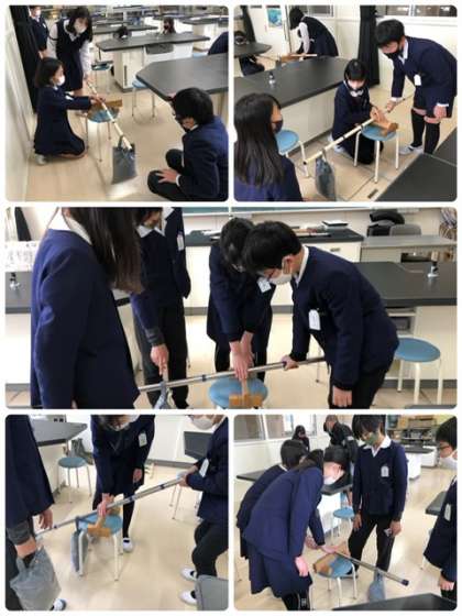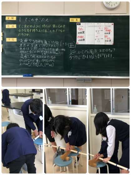 理科でてこの学習をしています。今日は、釘抜きや物干し竿などを使って実験しました。