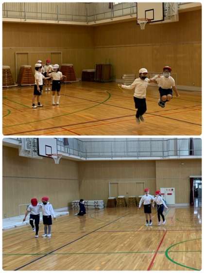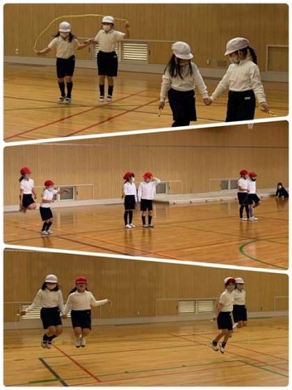 外はあいにくの雨。運動場で体育ができないため、講堂で縄跳びをしました。2人跳びがなかなか上手です。