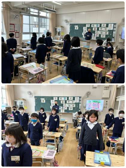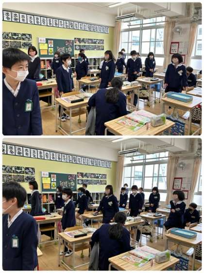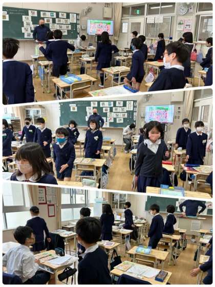 > 月曜日は、外国語活動の日です。今日は、先生の話す英語を聞いて動き、間違えたら座るというゲームをしました。よく聞いて取り組んでいました。