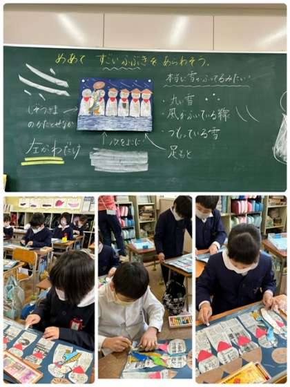 国語科の時間に学習している、かさこじぞうを図工でタイアップ!まもなく完成です!チョークなどを使い上手に仕上がってます。