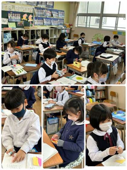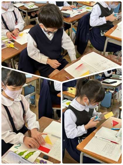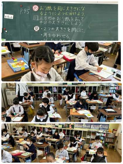 算数科で図形を学習しています。折り紙を折ってわかったことは何かな?