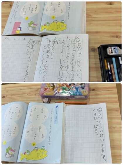 国語科、言葉を仲間分けして、文を作っています。みんな、どんどん思いつきます。ノートにその様子がよく記されています。