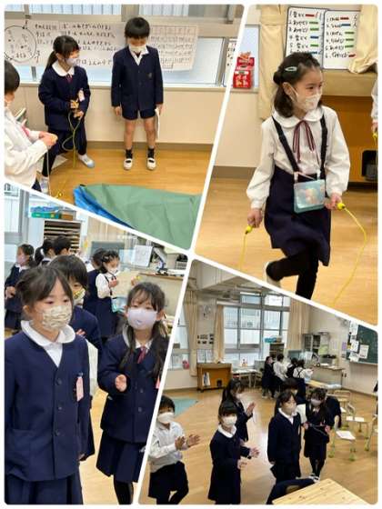 参観に向けての練習を頑張っています。縄跳び、あやとり、コマ回しに計算カードと多岐に渡っています。