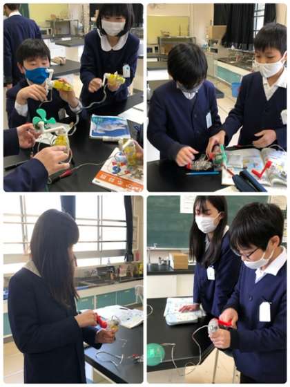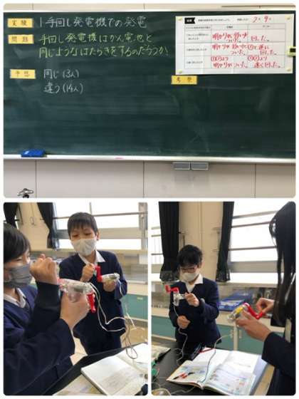 理科で、手回し発電機が乾電池と同じ働きができるか実験しました。