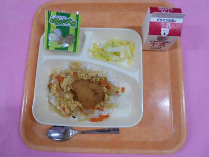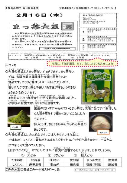 小学校の給食では、初登場になる「まっ茶大豆」がつきました。
