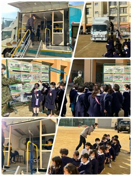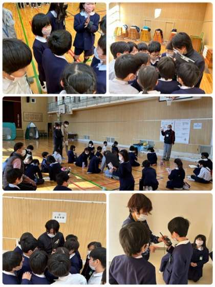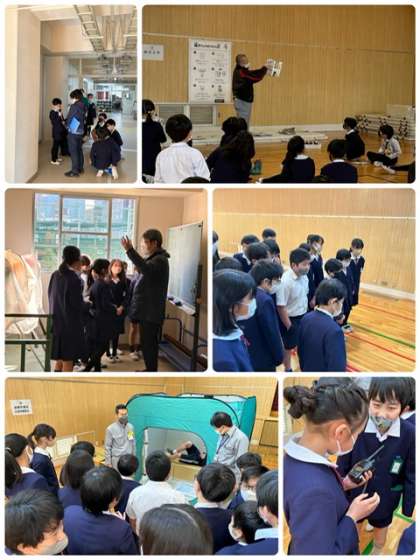 今日は午前中に、全学年で防災体験学習を行いました。起震車に乗ったり、防災グッズを見たり、トランシーバーを使ったり、水消化器を体験したりしました。他にも、災害救助について教えてもらったり、災害を想定したゲームやデジタルクイズなど、たくさんの体験をしました。