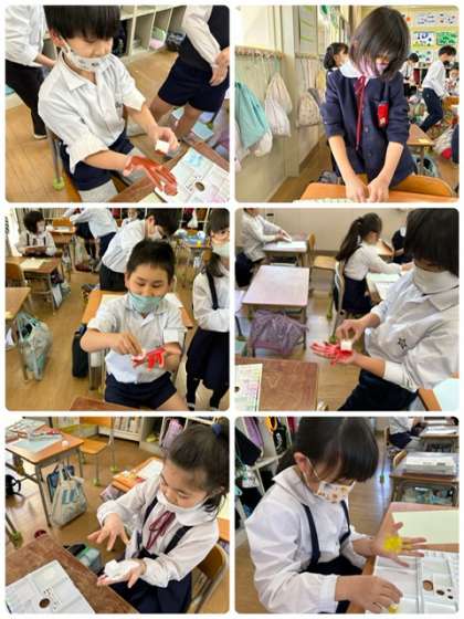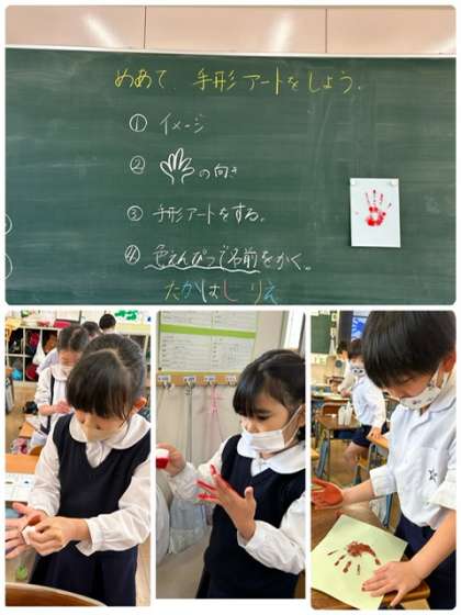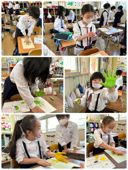 図工科で手形アートに取り組みました!手に絵の具を着けるのが、変な感じだったようです。