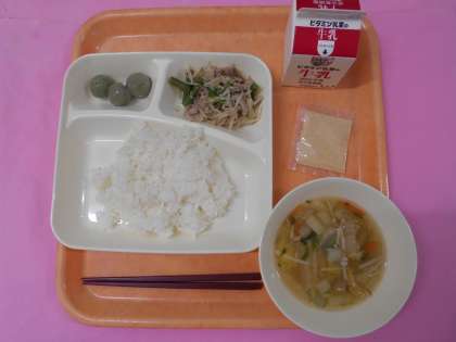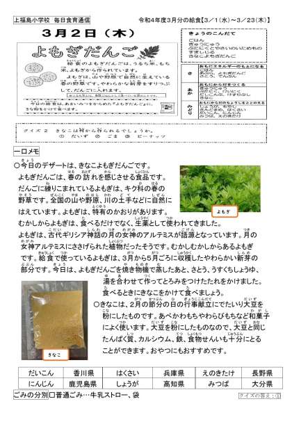 今日の給食のデザートは、春を感じるきなこよもぎだんごです。